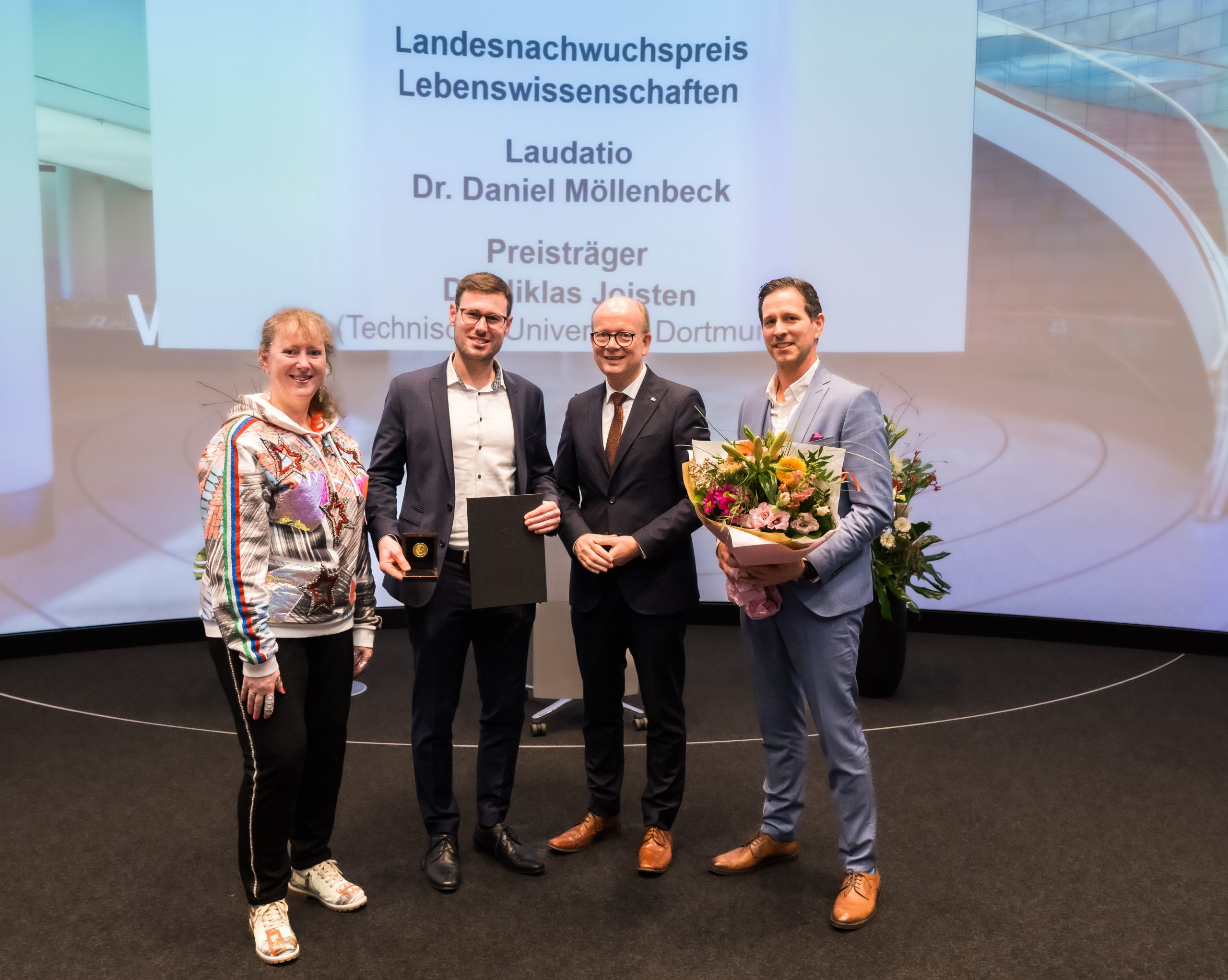 Der Landesnachwuchspreis in der Kategorie „Lebenswissenschaften“ ging an Dr. Niklas Joisten (TU Dortmund). In seiner Forschung untersucht er die biomedizinischen Wirkungen von Bewegung und Training, um individualisierte Trainingsempfehlungen zu entwickeln und Bewegung als wirksame Strategie der Gesundheitsförderung zu stärken. Die Laudatio hielt Dr. Daniel Möllenbeck, Präsident des Deutschen Sportlehrerverbandes und Jurymitglied.